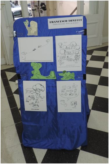 Muestras en el hall de ingreso al Aula Magna.: Viñetas de Francesco Tonucci; “En búsqueda de tesoros. Los juegos tradicionales” de las alumnas de la materia Epistemología de los Fenómenos Lúdicos de la Carrera de Prof. Y Licenciatura de Educación Inicial.
